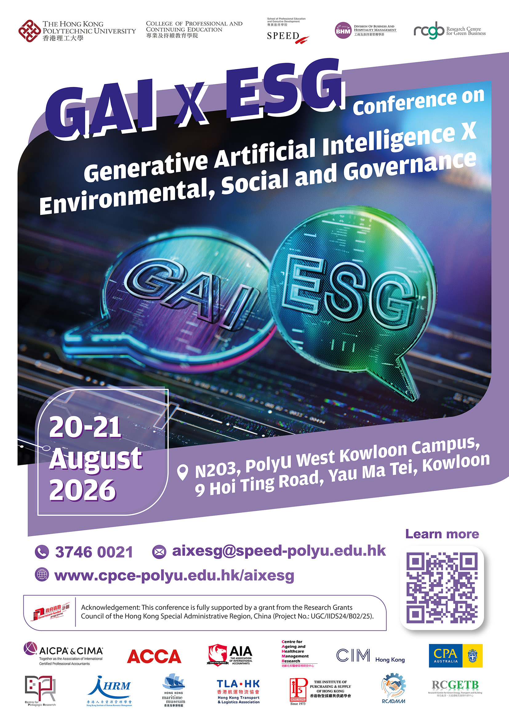 The Conference on Generative Artificial Intelligence X Environmental, Social and Governance is hosted by Division of Business and Hospitality Management and the Research Centre for Green Business (RCGB) at the School of Professional Education and Executive Development (SPEED) of The Hong Kong Polytechnic University (PolyU). The conference is dedicated to explore how generative AI (GAI) can be harnessed in marketing, human resource management, and supply chain management amid the rapid integration of Environmental, Social, and Governance (ESG) principles into today’s organizational practices. The event aims to demonstrate how theoretical concepts can be effectively integrated with practical applications to drive innovation led by ESG standards, bringing together leading academics, industry professionals, managers, and students to exchange research insights, case studies, and personal experiences. The conference aspires to establish a cohesive network that fosters the advancement of GAI by incorporating diverse perspectives.