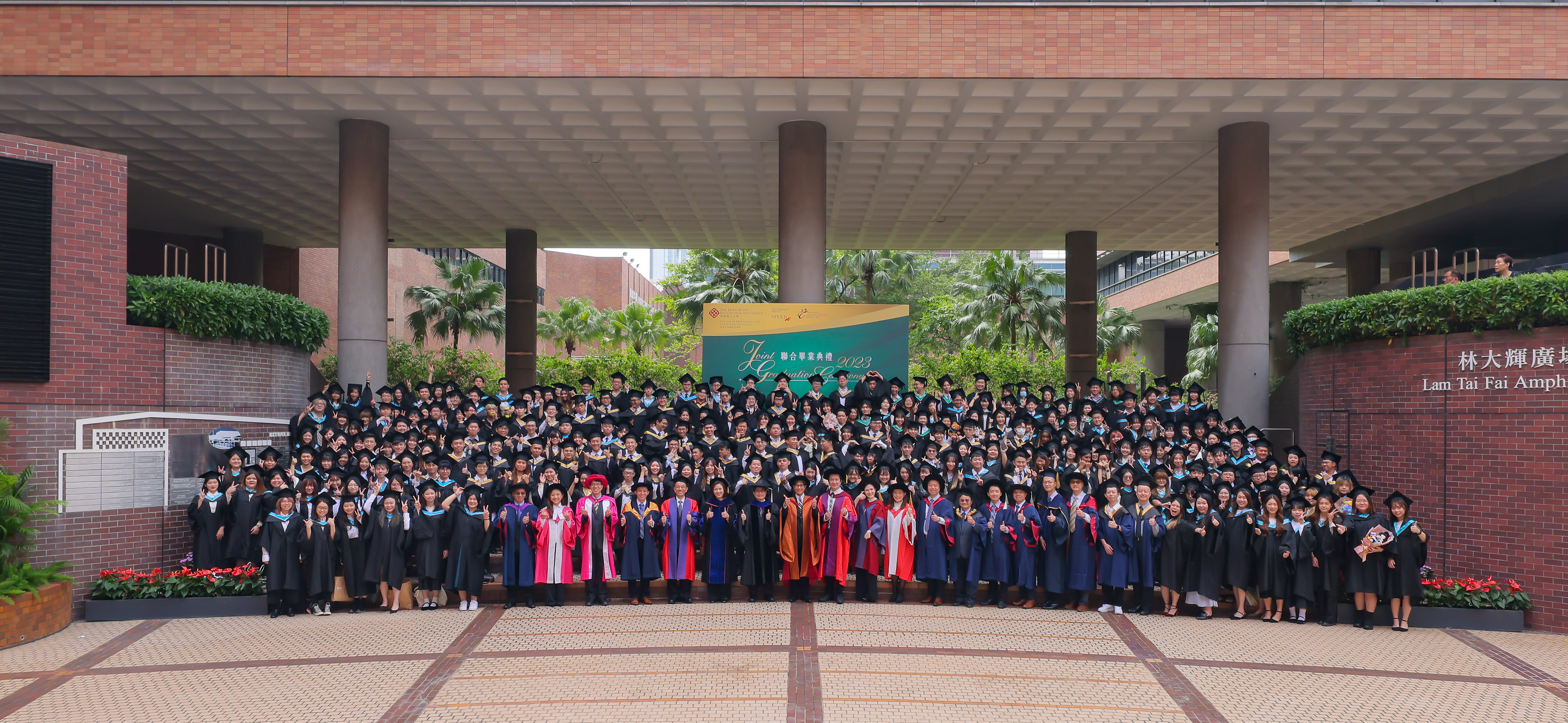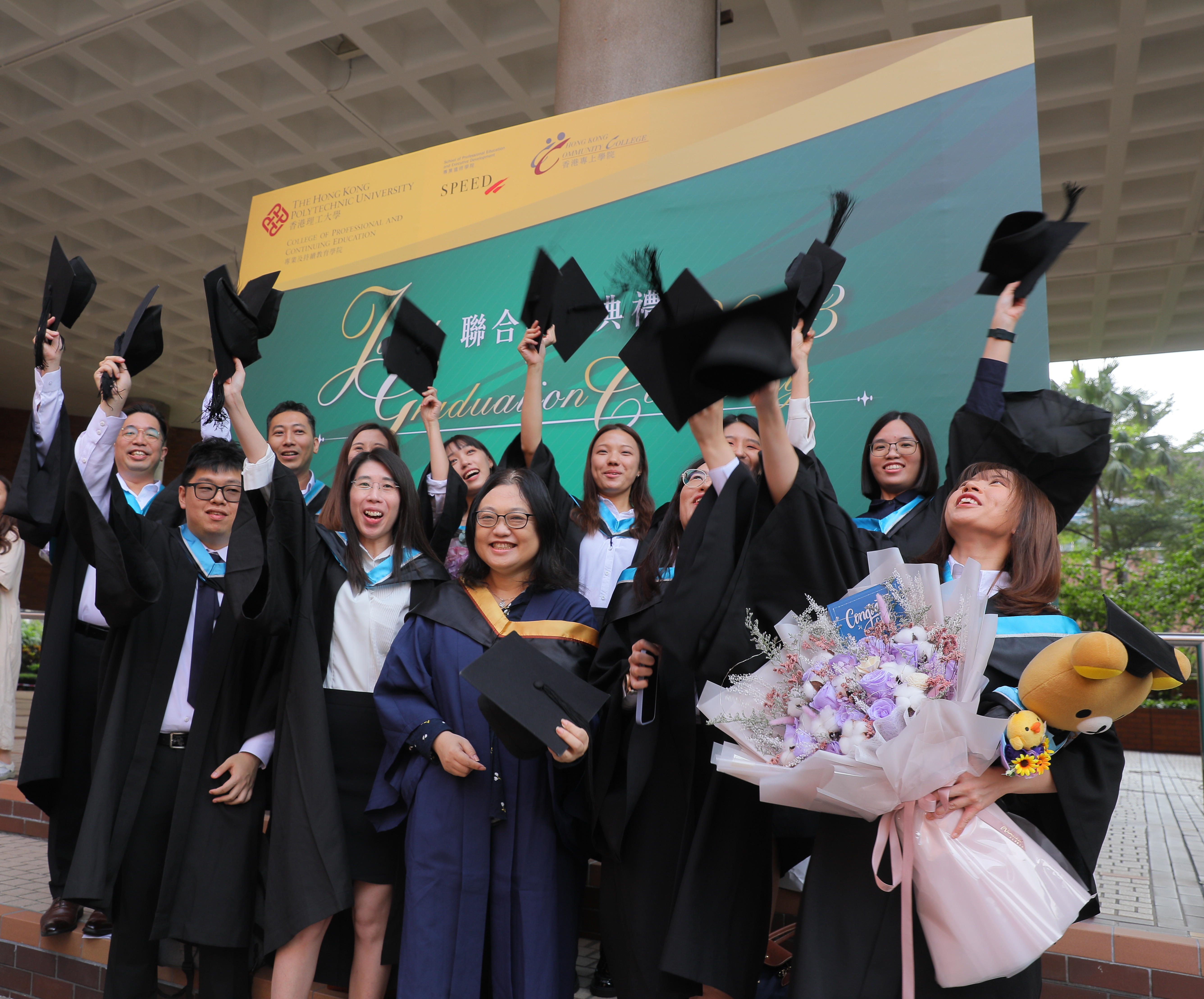 Hong Kong Community College (HKCC) and the School of Professional Education and Executive Development (SPEED), the educational units of the PolyU-affiliated College of Professional and Continuing Education (CPCE), held their 21st Joint Graduation Ceremony at PolyU’s Jockey Club Auditorium on 15 and 16 October 2023. PolyU HKCC and PolyU SPEED respectively sent forth over 3,300 sub-degree graduates and over 1,000 bachelor’s degree graduates.