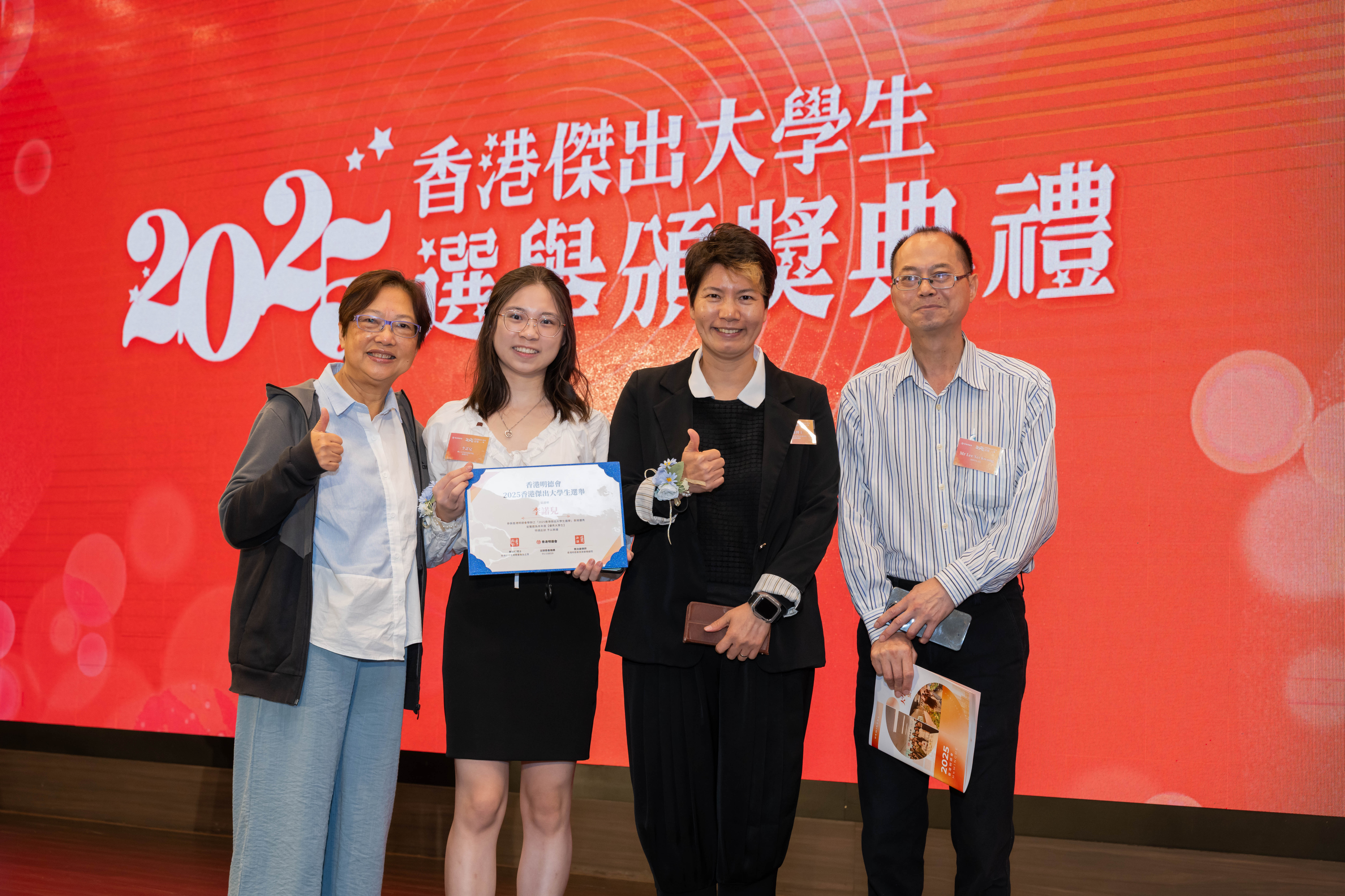 由香港明德会举办的「香港杰出大学生选举」今年已踏入第四届,旨在嘉许于学术、社会服务及领导才能方面表现杰出的大专学生。颁奖典礼于2025年11月10日举行,20位得奖学生均获颁证书、推荐信及港币5,000至10,000元的奖学金。