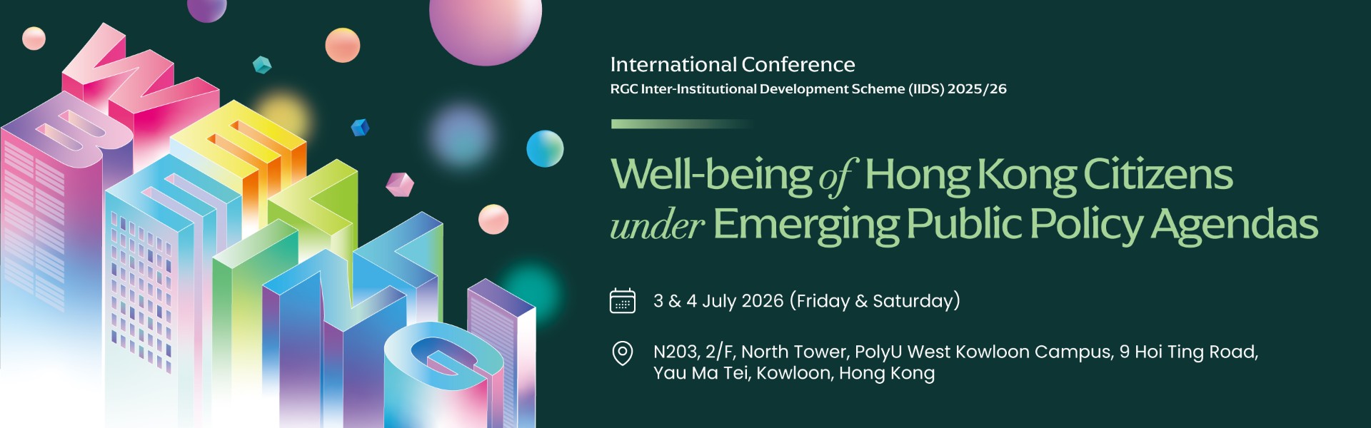 The International Conference of Well-being of Hong Kong Citizens under Emerging Public Policy Agendas will be held on 3 and 4 July 2026 (Friday & Saturday) in hybrid mode (ZOOM meeting & PolyU West Kowloon Campus, 9 Hoi Ting Road, Yau Ma Tei, Kowloon, Hong Kong). The main theme of the conference is "Well-being of Hong Kong Citizens under Emerging Public Policy Agendas".